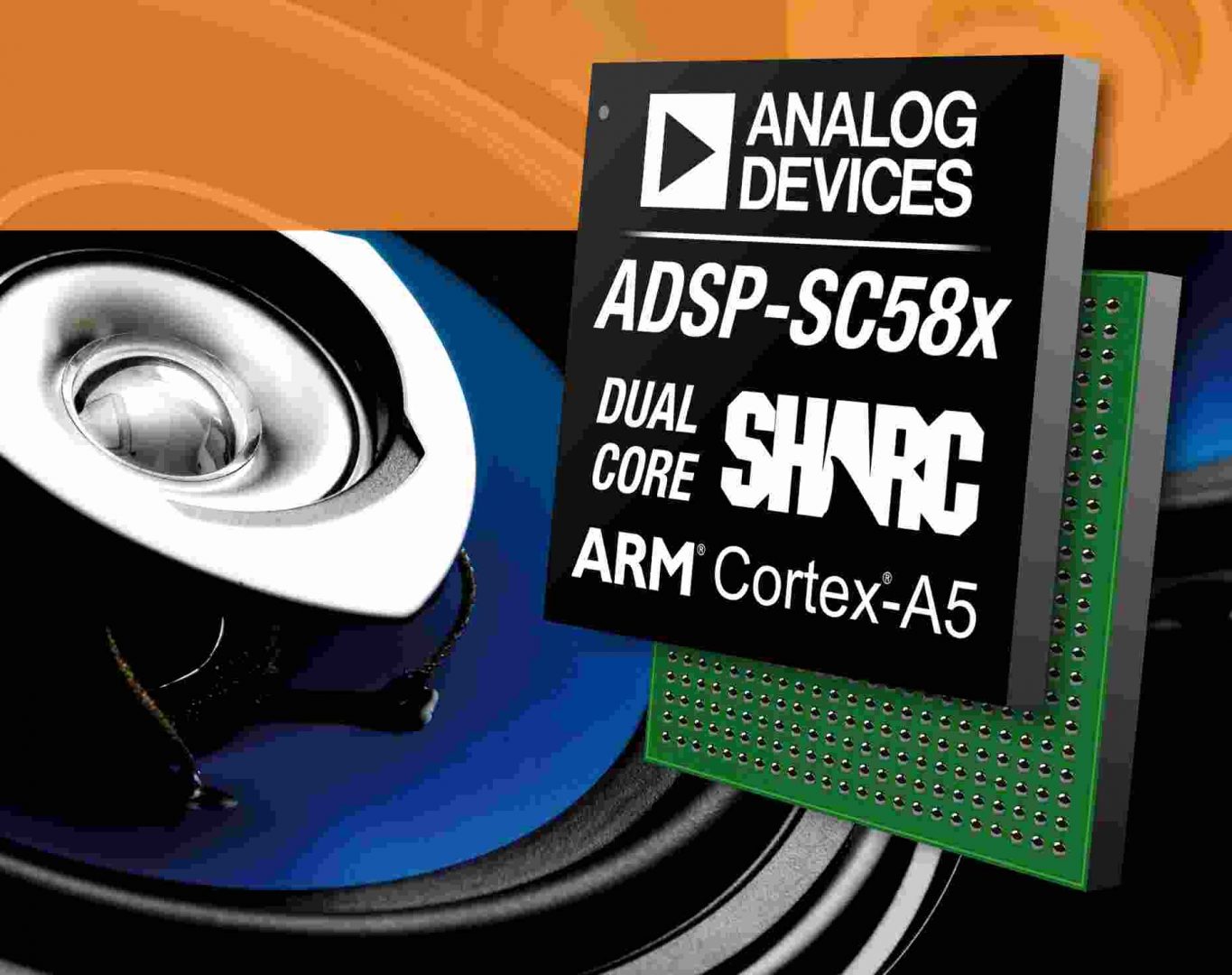 Les ADSP-SC58x d’Analog Devices combinent deux cœurs DSP SHARC+, des accélérateurs FFT, FIR et IIR et un cœur Risc Cortex-A5 lui-même doté d’extensions FPU et Neon de calcul numérique. L’objectif est de fournir une solution complète, alors que les autres nouveaux circuits d’Analog Devices, les ADSP-2158x dépourvus du cœur Cortex, demeurent destinés à être utilisés comme des coprocesseurs DSP autour d’un processeur central externe.