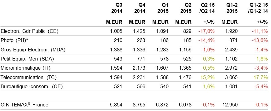 Les biens d’équipement de la maison ont enregistré un chiffre d’affaires de 6,1 milliards d’euros au second trimestre 2015, selon une récente étude de GfK Temax France. Le marché est resté stable par rapport à la même période de l’année précédente (-0,1%). Quatre secteurs sont en croissance au second trimestre, les télécommunications qui progressent de 15,2%, la micro-informatique, la bureautique et les consommables qui renouent avec la croissance avec des hausses respectives de 0,5% et 1,6%. Parmi les autres secteurs, l’électronique grand public enregistre une forte baisse de 17% et la photo est toujours en recul (-14%).