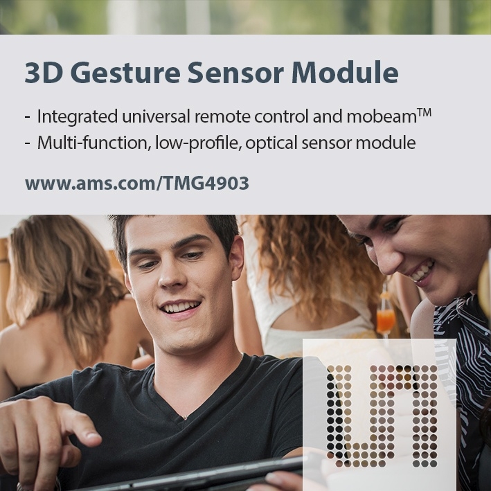 ams lance sous la référence TMx4903 une famille de modules de détection optique permettant d’ajouter de nombreses fonctions aux smartphones (télécommande universelle, émulation de code-barres, capteur de couleurs, détection de proximité et de mouvements), le tout dans un encombrement de seulement 5x2x1mm.