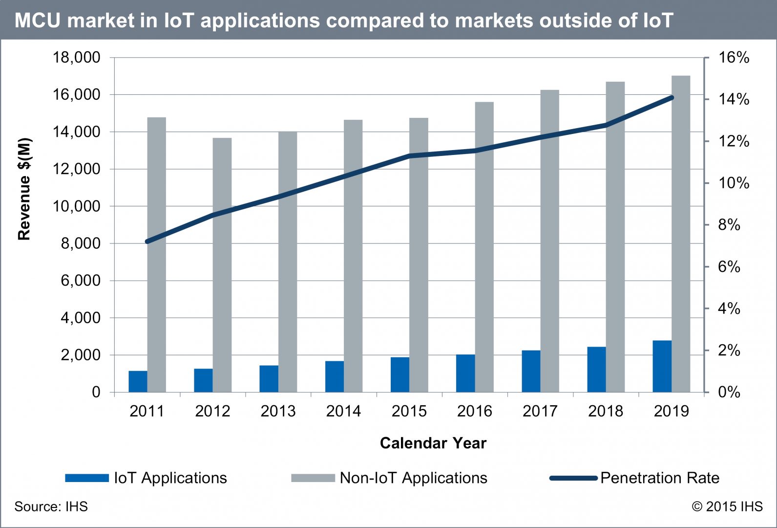 IHS prévoit que l’essentiel de la croissance du marché des microcontrôleurs sera dû à l’Internet des objets d’ici à 2019.