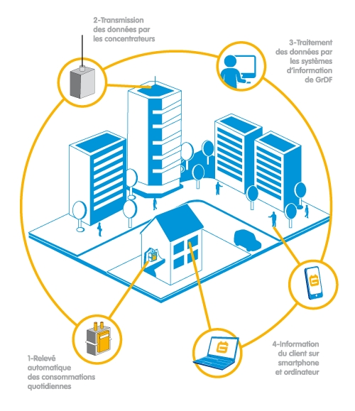Ces concentrateurs (au nombre de 15000) seront installés dès à présent, et sur une période qui s’étendra jusqu’en 2020, sur les points hauts des 9500 communes alimentées en gaz naturel. Rappelons que leur fonction est de servir de passerelles entre les compteurs communicants et le système d’information de GRDF. Ces données seront ensuite traitées et mises à disposition des clients sur le site de GRDF.