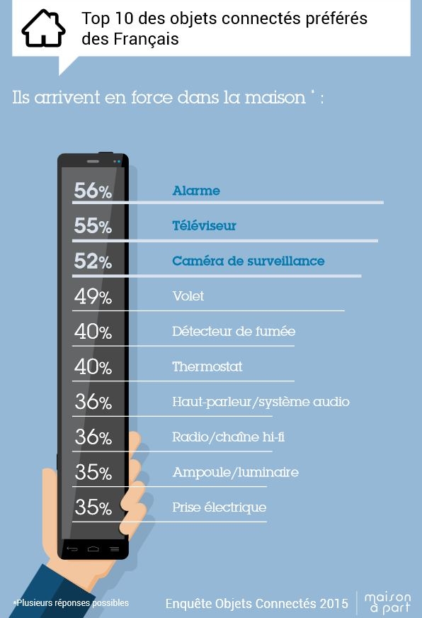 Parmi les objets préférés des Français, l’on retrouve dans l’ordre : l’alarme, le téléviseur et la caméra de surveillance. Le détecteur de fumée, devenu obligatoire chez les particuliers, est également sollicité dans sa version connectée, de même que les prises électriques.