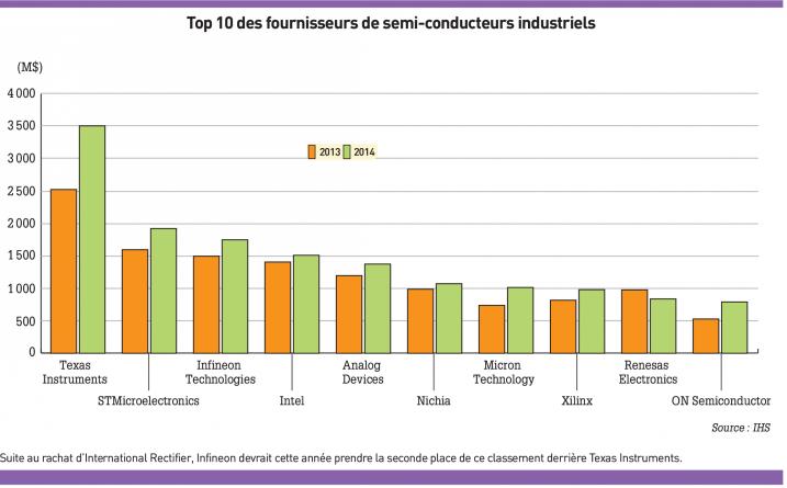 Les ventes de composants industriels ont encore progressé de 18% pour dépasser les 40 milliards de dollars en 2014, sous l’impulsion des marchés américains et chinois. Texas Instruments étend sa domination sur un secteur où les européens font mieux que résister.