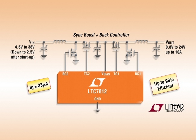 Le LTC7812 de Linear Technology prend la forme d’un double contrôleur DC-DC synchrone, avec Mosfet de puissance externes. Mis en cascade, les deux contrôleurs indépendants, travaillant en mode élévateur ou abaisseur, régulent la tension de sortie, que la tension d’entrée soit supérieure ou inférieure à cette dernière. Ce qui autorise un fonctionnement correct dans des conditions de démarrage à froid ou de rupture de charge.