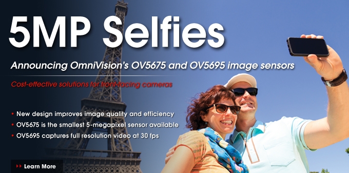 OmniVision Technologies lancera d’ici la fin de l’année la production en volume des OV5675 et OV5695, deux imageurs Cmos de 5 millions de pixels optimisés pour les caméras frontales des smartphones. Ces “capteurs à selfies” au format 4:3 délivrent jusqu’à 30 images par seconde à pleine résolution et 60 images/seconde en 720p ou 1080p.