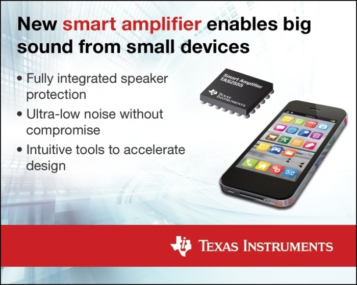 Le TAS2555 de Texas Instruments est un amplificateur audio de 5,7W, doté d’une fonction de protection du haut-parleur, susceptible de fonctionner avec tout processeur doté d’une interface I²S.