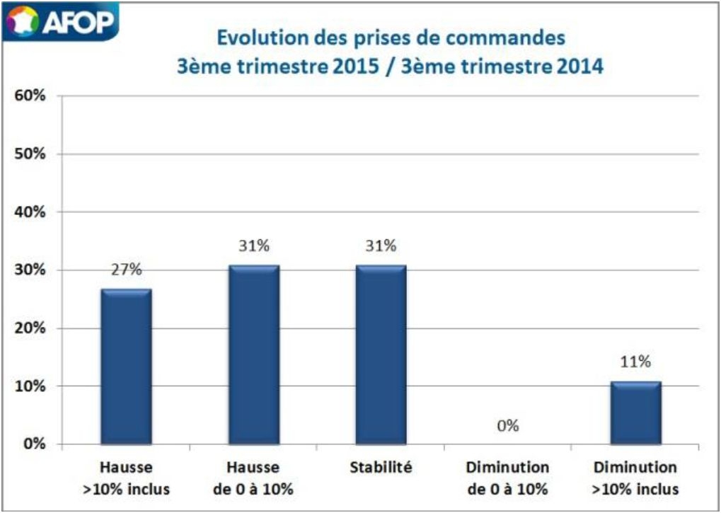 A périodes égales (janvier-septembre 2015 par rapport à janvier-septembre 2014), la tendance positive des prises de commandes de l’année 2015 par rapport à l’année 2014 se confirme : 81% des entreprises interrogées évoquent des prises de commandes stables (18%) ou en augmentation (37% en hausse de 0 à 10%, 26% en hausse de plus de 10 %) alors que ce chiffre ne dépassait pas 66% en 2014.