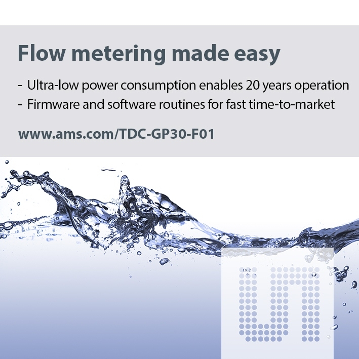 ams étend sa famille de circuits de mesure de débit à ultrasons en lançant la production en volume du TDC-GP30-F01. Ce circuit comprend un frontal analogique de mesure par ultrasons, un coeur 32 bits à basse consommation et le firmware nécessaire pour tirer des sorties analogiques les informations de débit, de volume et de température de l’eau. Il vise principalement les compteurs d’eau et ne consomme que 8,5µA pour des mesures de flux à 8Hz.