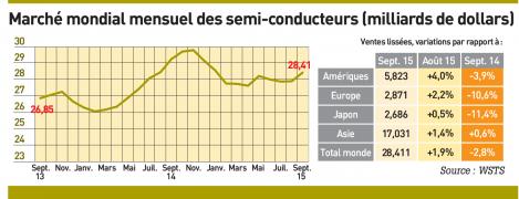 > Les ventes mondiales de semi-conducteurs ont atteint 28,411 milliards de dollars, en hausse de 1,9% par rapport au mois d’août. Sur les neuf premiers mois de l’année, la progression des ventes mondiales n’est que de 1,5%, et ce léger rebond séquentiel ne permettra sans doute pas de finir l’année 2015 sur une note positive.