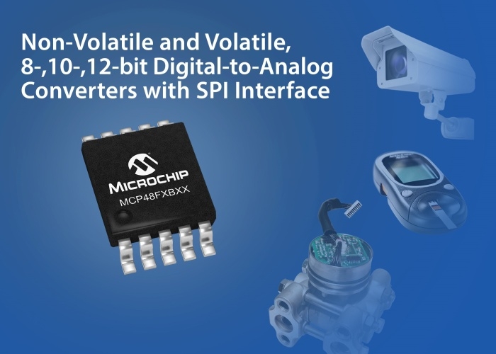 Forte de six éléments intégrant une EEprom, la famille MCP48FXBXX se compose de CNA à un ou deux canaux de résolution 8, 10 ou 12 bits.