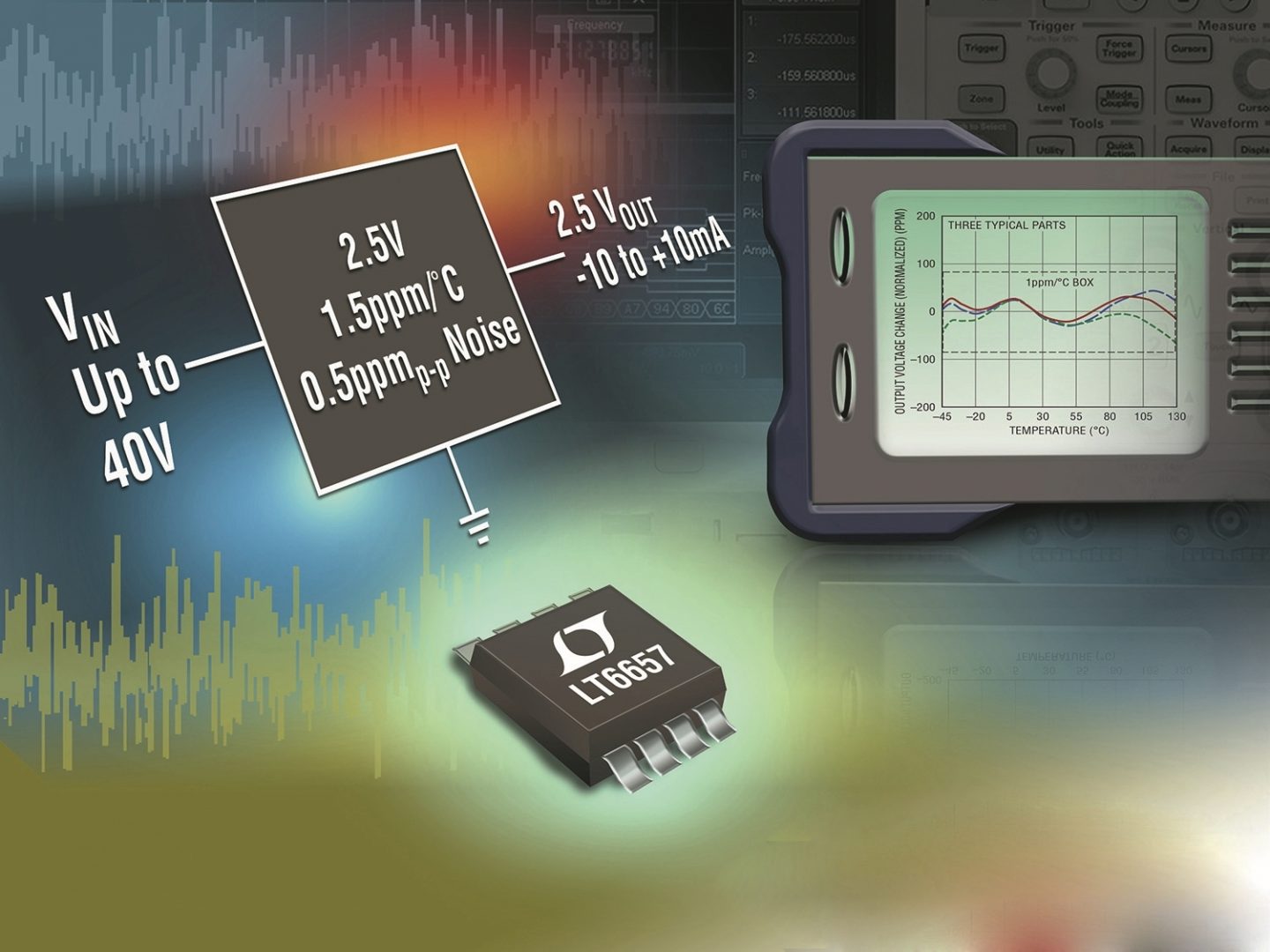 Avec le LT6657, Linear Technology introduit une référence de tension à barrière de potentiel (ou de type bandgap, tension de la bande interdite), compensée en température. La dérive en température est ici inférieure à 1,5 ppm/°C entre -40°C et +125°C, une caractéristique inédite pour un circuit de cette catégorie. Par ailleurs, le niveau de bruit BF reste très bas, soit 0,5 ppm crête-à-crête dans la bande 0,1 à 10Hz et 0,8 ppm RMS entre 10Hz et 10kHz.