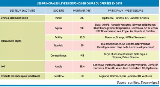 Alors que Sigfox a levé 100 millions d’euros au 1er semestre, Parrot espère mobiliser le triple de cette somme à courte échéance. Les fonds d’investissement se mobilisent, mais aussi les grands groupes. Legrand a investi dans Netatmo, Samsung a pris une participation dans Sigfox, Valeo est entré dans le capital d’Aledia. Et Cisco et Microsoft