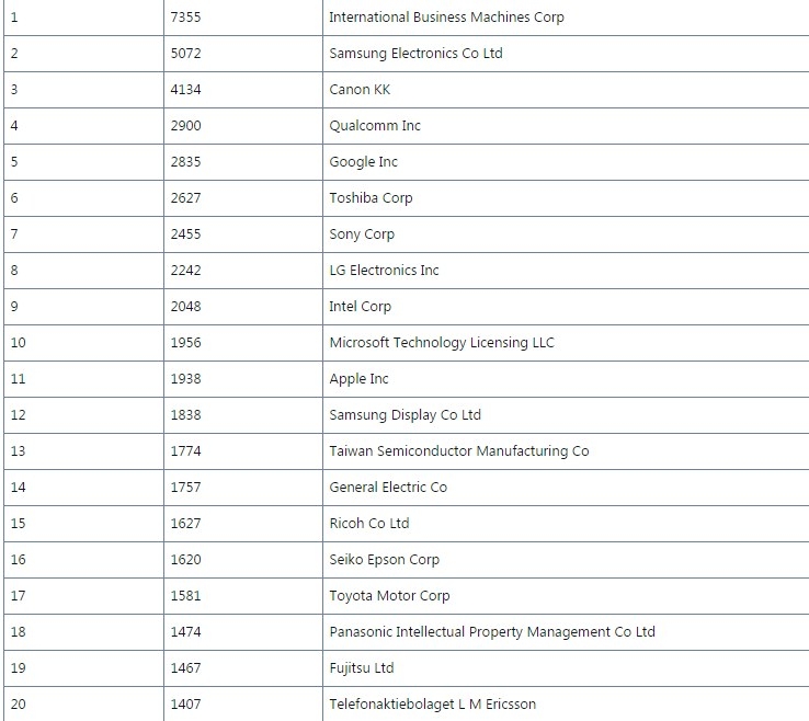Selon IFI Claims Patent Services, un important producteur de bases de données de brevets mondiaux, solutions analytiques et services web innovants, IBM est en légère baisse par rapport à 2014 en matière de brevets délivrés, mais garde cependant sa première place, devant Samsung et Canon qui conservent leurs positions de 2014 avec de légers progrès.