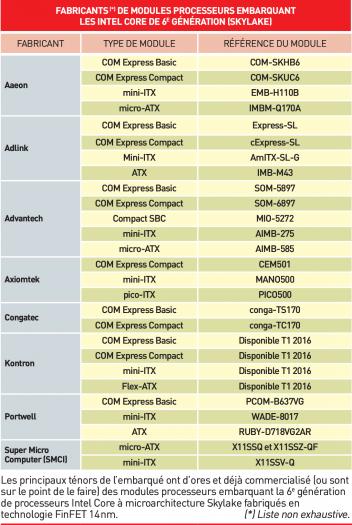 Aaeon, Adlink, Advantech, Axiomtek, Congatec, Kontron, Portwell, et d’autres, proposent déjà à leur catalogue –ou sont sur le point de le faire– des modules processeurs intégrant les Intel Core de 6e génération. Parmi les avancées de cette technologie, une enveloppe thermique ajustable à moins de 15W permet de booster les performances des systèmes embarqués compacts