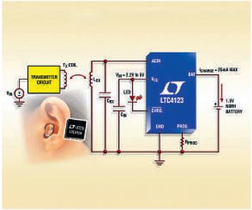 A vec le LTC4123, Linear Technology propose un chargeur de batterie sans fil dédié aux prothèses auditives. Ce circuit combine un récepteur et un chargeur linéaire exploitant un algorithme classique CC/CV (charge à courant constant,