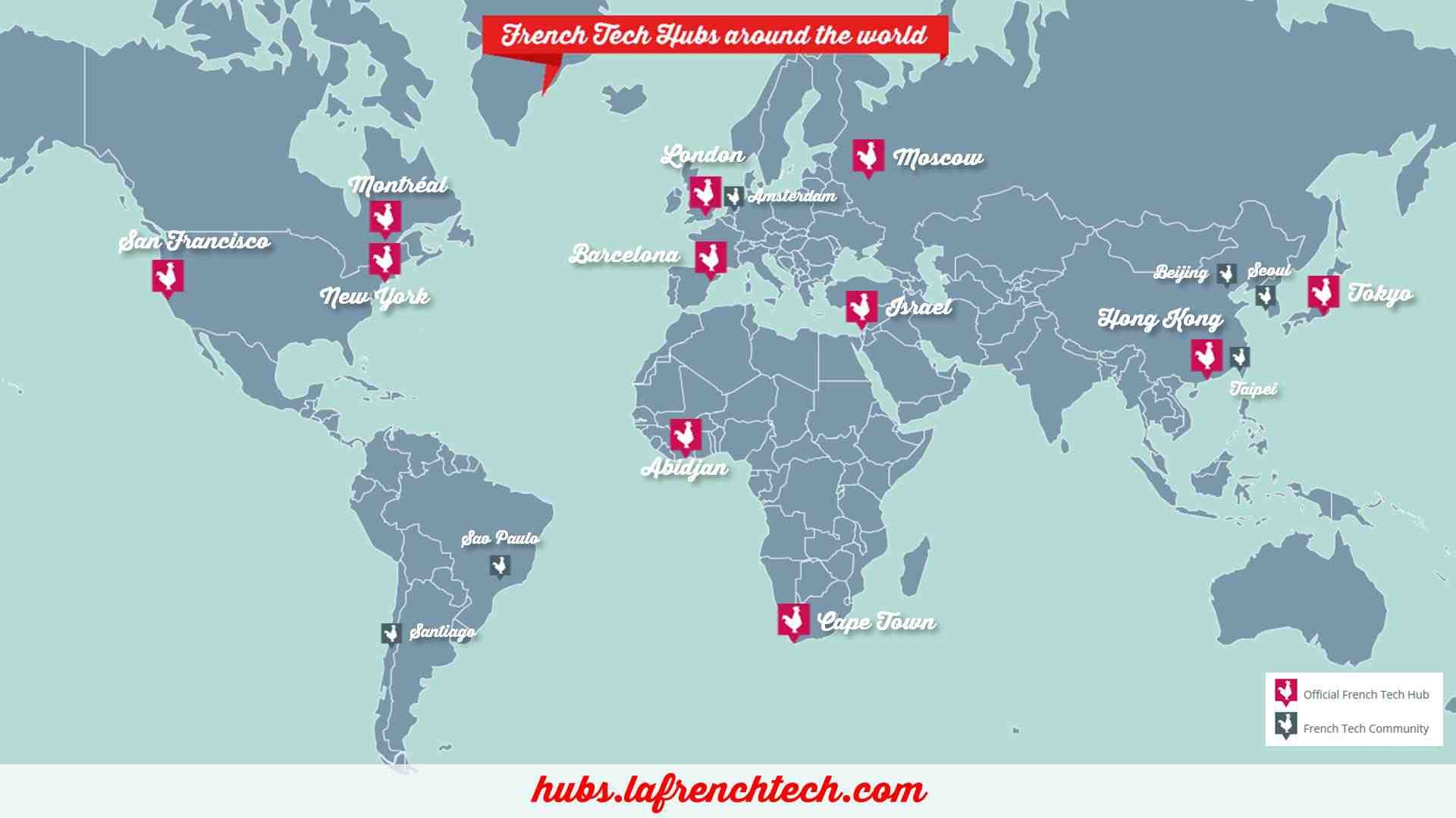 Le 29 janvier dernier a été annoncé le lancement de 6 nouveaux French Tech Hubs : Abidjan, Cape Town, Londres, Barcelone, Hong-Kong : portant à 11 le nombre total de communautés French Tech structurées à l’international. Cinq communautés French Tech avaient déjà été labellisées : New-York, Israël, Tokyo, San Francisco et Moscou.