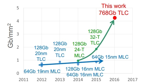 Micron empile ici 32 couches de cellules à 3 bits/cellule, dans une structure originale où l’ensemble des blocs de traitement du signal (chemins de données, buffers de page, pompes de charge, drivers, etc.) sont formés en-dessous du réseau de cellules mémoires proprement dites. Il devient dès lors possible de segmenter les lignes de mots (word lines) et les lignes de bits (bit lines) pour gagner en rapidité d’accès : le débit de données atteint ici 800Mo/s en lecture et 44Mo/s en écriture.