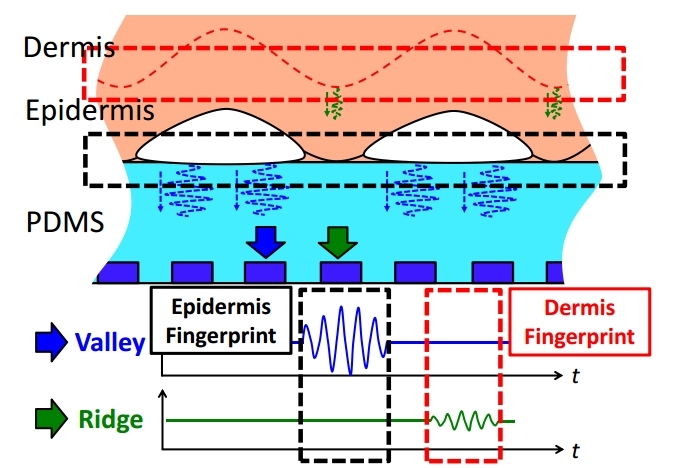 Le capteur développé repose sur une mesure par ultrasons émis par un réseau d’émetteurs situés sur la surface du composant et détectant les creux et bosses du derme, sous la peau, en fonction des signaux absorbés et renvoyés. La partie sensible mesure 3,25×4,74mm et comporte 56×110 membranes piézoélectriques, soit une concentration d’environ 500dpi.