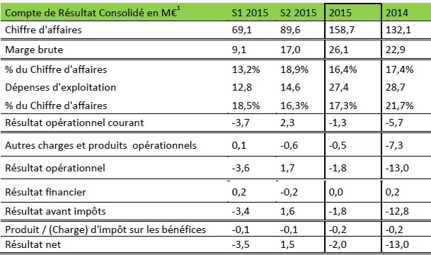 La marge brute s’est élevée à 26,1 M€ en 2015, en croissance de 14 % par rapport à 2014. La société commence à tirer profit des efforts mis en oeuvre pour raccourcir sa chaîne de valeur, tout en garantissant une meilleure qualité des produits. Le groupe a également été en mesure de s’adapter à la baisse de l’euro contre le dollar.