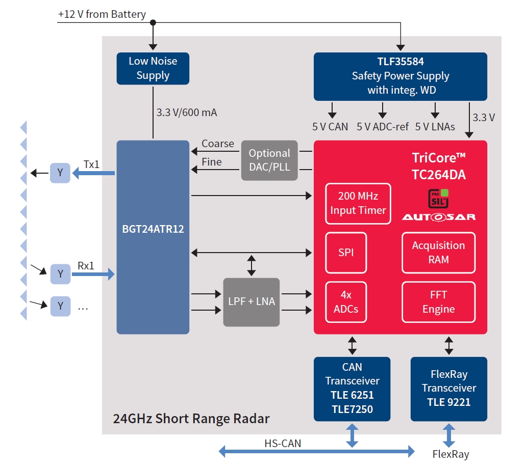 Infineon Technologies a profité du salon bauma 2016 qui se tient actuellement à Munich pour présenter son dernier jeu de circuits pour radar 24GHz, destiné à améliorer la sécurité des poids lourds et des véhicules de chantier. Il est composé d’un circuit radiofréquences (BGT24ATR12), d’un microcontrôleur Aurix (la gamme dérivée du TriCore pour l’automobile) optimisé pour l’occasion (TC264DA) et d’un circuit d’alimentation dédié (TLF35584). Un kit de développement est également disponible.