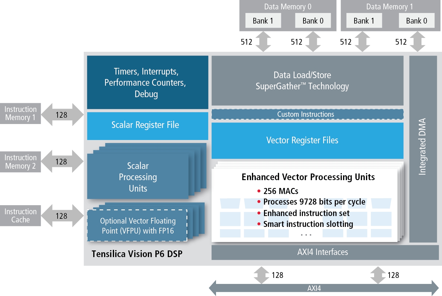 Cadence ajoute à son catalogue de processeurs disponibles sous forme de propriété intellectuelle le Tensilica Vision P6. Ce modèle haut de gamme s’avère quatre fois plus puissant que le précédent Vision P5 et vise notamment les systèmes d’imagerie et les réseaux neuronaux convolutifs. Il comprend entre autres une unité de calcul optionnelle en virgule flottante SIMD à 32 canaux conforme à la norme IEEE FP16.