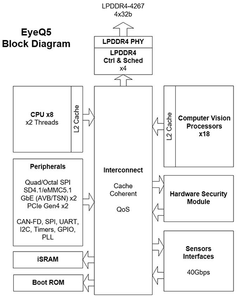 L’objectif est de multiplier par huit la puissance de calcul par rapport à l’actuel EyeQ4 pour atteindre plus de 12Tops tout en maintenant la consommation sous la barre des 5W afin de garder une dissipation passive. Les premiers échantillons sont prévus pour 2018.