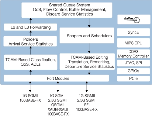 Sont également intégrés jusqu’à deux blocs de gestion de couche physique PHY et deux blocs de mise en série/parallelle Serdes 10Gbit/s.