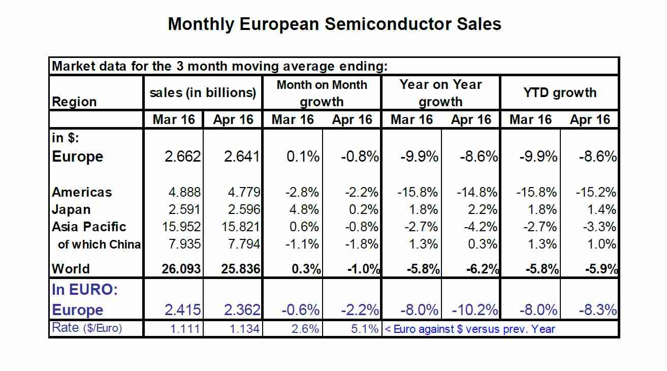 Les ventes de semi-conducteurs en Europe ont atteint 2,641 milliards de dollars en avril 2016, en légère diminution par rapport au mois de mars, selon les statistiques du WSTS relayées par l’Esia, l’association européenne de l’industrie des semi-conducteurs. Ces résultats sont en ligne avec les performances de ce marché à l’échelle mondiale dont les ventes étaient en baisse de 1% en avril par rapport au mois précédent, à 25,836 milliards de dollars.