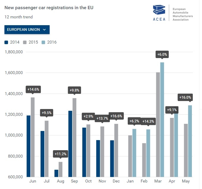 Sur les cinq premiers mois de 2016, la hausse du marché européen atteint 9,7% à 6,58 millions de véhicules, soit une accélération par rapport à la progression de 8,3% de la période janvier-avril, précise l’Acea. “Le marché devrait poursuivre sur cet élan positif”, estime l’Acea dans un communiqué. Il y a deux semaines, l’association a multiplié par deux sa prévision de croissance, tablant désormais sur une hausse de 5% du marché, contre +2% précédemment.