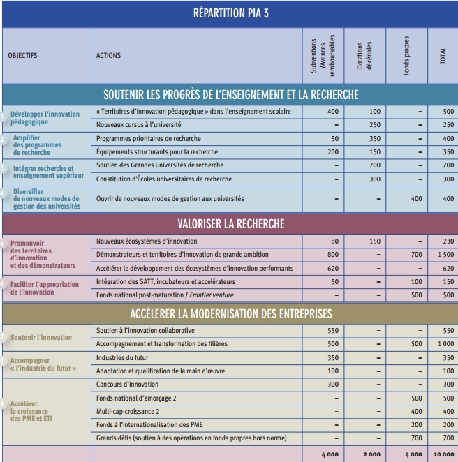 Après une évaluation des deux premiers volets de ce programme, rendue publique en avril dernier (dans lesquels 47 milliards d’euros, dont plus de 33 milliards ont déjà été engagés depuis 2010), il ne s’agira plus, désormais, de distribuer des enveloppes par secteur, mais de mettre en place une organisation plus souple, de l’amont vers l’aval, c’est-à-dire de l’enseignement et la recherche vers l’innovation et le développement des entreprises. Le PIA3 pourra dynamiser des secteurs jusqu’alors peu couverts, tels que les industries de sécurité, l’agroalimentaire ou encore le tourisme.