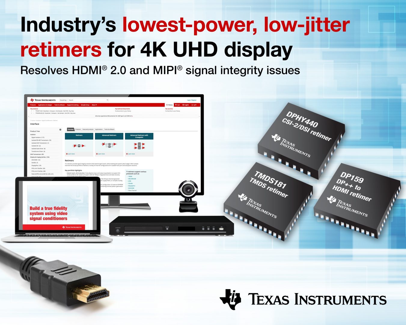 Texas Instruments lance une famille de circuits de resynchronisation à faible cosommation et gigue réduite destinés aux équipements vidéo UHD 4K. Les SN65DPHY440SS, SN75DPHY440SS, SN65DP159, SN75DP159 et TMDS181 permettent d’étendre la portée des signaux vidéo sans dégrader leur qualité, avec une consommation annoncée comme étant inférieure de 60% à celle des solutions concurrentes. Les DP159 et TMDS181 assurent en outre une égalisation adaptative des signaux jusqu’à 15dB. Tous ces circuits sont disponibles en boîtier VQFN ou WQFN.