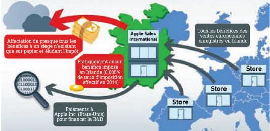 La Commission européenne a conclu que l’Irlande avait accordé à Apple des avantages fiscaux indus pour un montant de 13 milliards d’euros. Elle juge cette pratique illégale au regard des règles de l’Union européenne en matière d’aides d’Etat, estimant que “ces aides ont a permis à Apple de payer nettement moins d’impôts que les autres sociétés pendant de nombreuses années”. Elle demande à l’Irlande de récupérer “les aides illégales”, ce dont les autorités de ce pays, qui a accueilli de nombreuses entreprises américaines sur son sol, se refuse à faire…