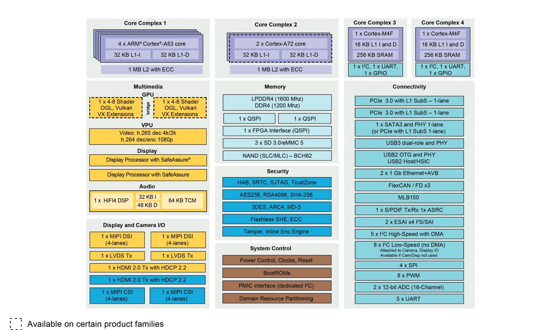 NXP échantillonnera début 2017 de nouveaux processeurs embarqués i.MX 8 visant les tableaux de bord haut de gamme. Ces circuits sont architecturés autour de cœurs 64 bits ARMv8-A entourés d’un DSP HiFi 4, de contrôleurs pour mémoires DDR4/LPDDR4, de quatre contrôleurs d’écran HD et d’un double port Gigabit Ethernet compatible AHB. Le plus puissant, l’i.MX 8QuadMax, comprend deux cœurs Cortex-A72, quatre Cortex-A53, deux Cortex-M4F (pour les tâches temps réel) et deux moteurs graphiques GC7000XS/VX. Plus modeste, l’i.MX 8QuadPlus se contente d’un Cortex-A72 et d’accélérateurs graphiques GC7000LiteXS/VX. Enfin, l’i.MX 8Quad se passe de cœur Cortex-A72.