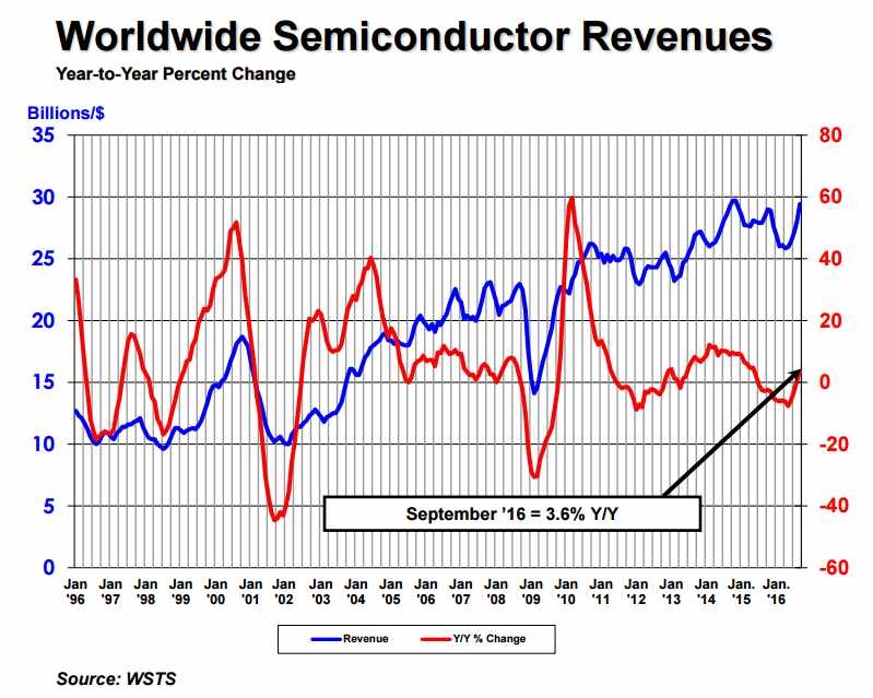 Le marché mondial des semi-conducteurs a atteint 88,3 milliards de dollars au 3è trimestre 2016, en progression de 11,6% par rapport au trimestre précédent, réalisant ainsi la meilleure performance trimestrielle jamais obtenue, selon les données du WSTS (World Semiconductor Trade Statistics) relayées par le SIA, l’Association de l’industrie améraine des semi-conducteurs. Les ventes du mois de septembre 2016 ont totalisé 29,4 milliards de dollars, en hausse de 3,6% par rapport à septembre 2015 et de 4,2% par rapport au mois précédent.