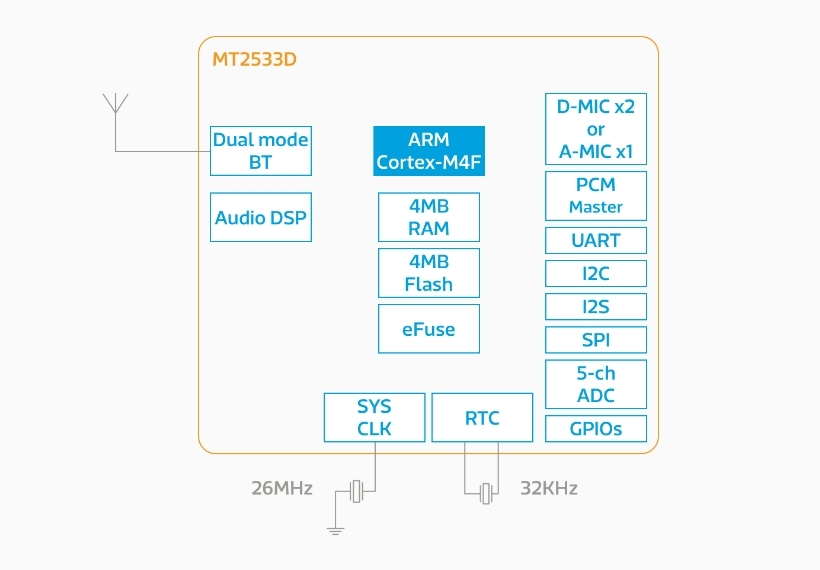 MediaTek a annoncé au CES de Las Vegas le MT2533D, un module destiné aux casques audio sans fil et aux kits mains libres haut de gamme. Il embarque un coeur de microcontrôleur 32 bits Cortex-M4 cadencé jusqu’à 208MHz, un moteur DSP HiFi Mini de Tensilica, 4Mo de mémoire flash et autant de Sram, et un sous-système Bluetooth complet supportant les mode 2.1 et 4.2 Low Energy. Sont également présentes de nombreuses interfaces incluant des ports USB2.0 et MIPI-DSI (pour la gestion d’un écran). Le MT2533D est encapsulé dans un boîtier TFBGA mesurant 6,2×5,8×1,05mm.