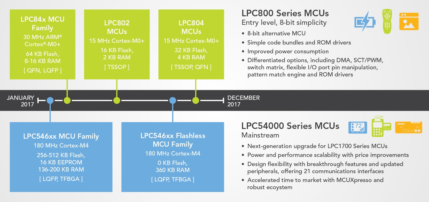 Plus puissants, les LPC54000 bénéficient d’un coeur Cortex-M4 cadencé jusqu’à 180MHz, d’un contrôleur d’écran 1024×768, de fonctions audio comme la conversion PDM-PCM et d’interfaces sophistiquées (Ethernet, USB, Quad SPI). Les premiers LPC546xx seront disponibles en volume au mois de mars 2017.