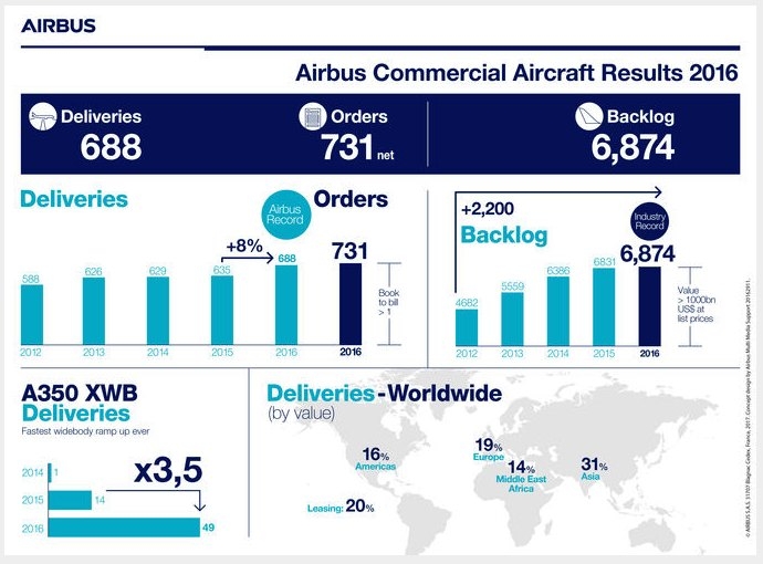 Airbus a enregistré 731 commandes nettes émanant de 51 clients, dont 8 sont nouveaux.Fin 2016, le carnet de commandes global d’Airbus totalisait 6.874 appareils d’une valeur de 1,018 milliard de dollars aux prix catalogue