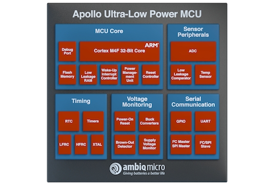 Connu pour sa technologie de conception numérique fonctionnant sous la tension de seuil (subthreshold) et une première génération de microcontrôleurs Apollo à très faible consommation, Ambiq Micro poursuit son chemin en échantillonnant sa seconde génération de microcontrôleurs. Toujours organisés autour d’un coeur Cortex-M4F, les Apollo 2 voient leur consommation passer sous la barre des 10µA/MHz (contre 35µA/MHz pour la génération précédente), doublant ainsi en pratique l’autonomie des appareils wearables et autres systèmes nomades selon l’américain.