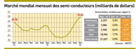 > Alors que Gartner vient de publier un bilan en hausse de 1,5% pour le marché mondial des semi-conducteurs en 2016, les statistiques mondiales du mois de novembre montrent une nouvelle progression séquentielle de 2% par rapport au mois précédent à plus de 31 milliards de dollars. Sur les 11 premiers mois de 2016, la