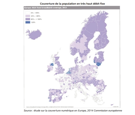 La France accuse un retard important dans le déploiement du très haut débit en raison de ses caractéristiques géographiques et d’une moindre réutilisation des infrastructures existantes. En juin 2015, seuls 45 % des foyers étaient couverts en très haut débit fixe, contre une moyenne européenne à 71 %, ce qui confère à la France le 26e rang sur 28.