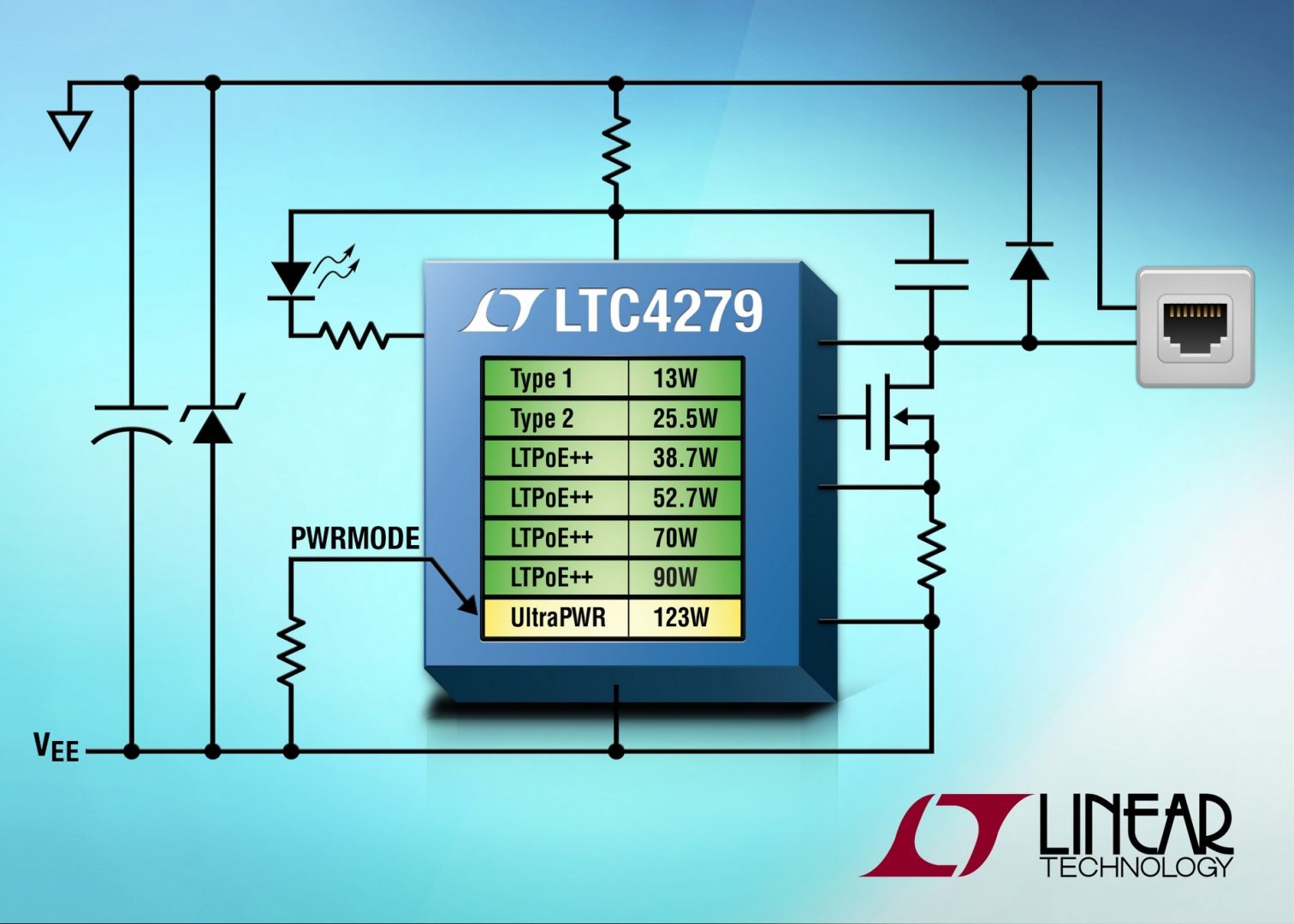 Afin de répondre à la demande d’un large éventail d’applications pour lesquelles la puissance électrique normalement dispensée via un câble Ethernet se révèle insuffisante, Linear Technology introduit le LTC4279, un contrôleur autonome à un seul port destiné aux équipements fournisseurs d’énergie (PSE, Power sourcing equipment). Un tel circuit est à même de délivrer une puissance de 123W par l’intermédiaire d’un câble de catégorie 5 (CAT-5e). Pour ce faire, un mode particulier, dit UltraPWR, est mis en oeuvre avec des équipemnts récepteurs d’énergie (PD, Powered device) personnalisés.
