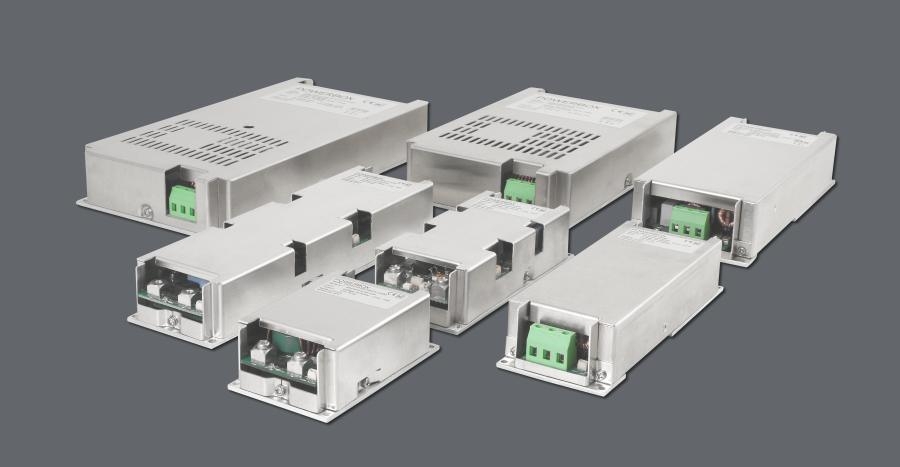 Pour ce qui est des unités AC-DC des séries DBx, entre 150W et 1200W, la conception a également été optimisée pour un fonctionnement dans les environnements difficiles. Les DBA/DBB/DBC/DBD comportent un filtre d’entrée, un limiteur de courant d’appel actif et un correcteur du facteur de puissance. La tension d’entrée (85 à 264Vac) est universelle, alors que la fréquence de la source peut atteindre 400Hz. Le concept modulaire se traduit par un large éventail de tensions de sortie entre 2V et 54V et différentes configurations avec de 1 à 6 sorties. L’isolation est de 1500Veff entre l’entrée et la masse, de 3000Veff entre l’entrée et la sortie et de 500Veff entre la sortie et la masse. Le rendement est typiquement de 85%, avec une faible consommation en veille.
