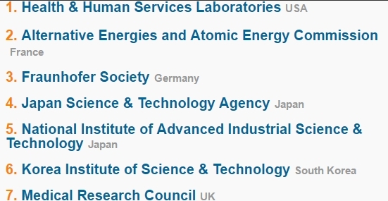 Ce classement se fonde sur l’intégration de données relevant de la propriété intellectuelle, du nombre de brevets et de publications indexés dans la base de données des plates-formes de Thomson-Reuters au cours des huit dernières années. Le numéro un est le Health & Human Services Laboratories, aux Etats-Unis.