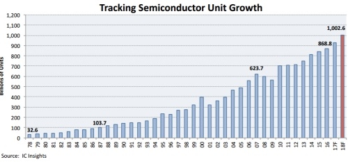 Les livraisons de semi-conducteurs ont totalisé 868,8 milliards d’unités l’an dernier et devraient atteindre 900 milliards d’unités en 2017, selon IC Insights. En 2018, les expéditions unitaires devraient dépasser mille milliards d’unités après avoir progressé au rythme moyen de 9% par an depuis 1978, alors que les livraisons totalisaient 32,6 milliards d’unités, soit près de 30 fois moins qu’actuellement.