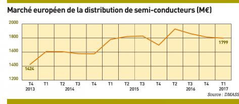 > L’an passé, les ventes de la distribution européenne de semi-conducteurs industriels (hors composants pour PC) ont progressé de 3,8% par rapport à 2015, à 7,4 milliards d’euros. Au quatrième trimestre 2016, les ventes ont affiché une hausse sur un an de 5,8% à 1,799 milliard d’euros, selon DMASS