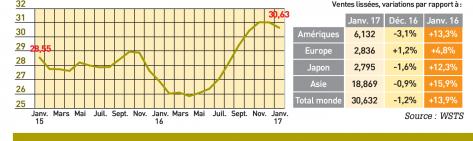 > Par rapport à janvier 2016, les ventes de janvier 2017 ont fait un bond de 13,9% dans le monde à 30,632 milliards de dollars, mais elles n’ont progressé que de 4,8% en Europe à 2,836 milliards de dollars. Cela signifie que notre continent ne représente que
