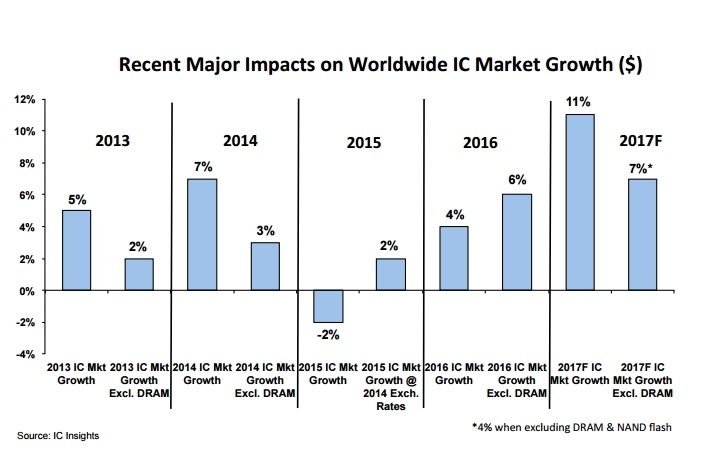 Le cabinet d’études IC Insights a plus que doublé sa prévision de croissance pour le marché des semi-conducteurs en raison d’une hausse sensible des prix des mémoires Dram et Flash Nand. Ses prévisions du marché s’établissent désormais à 11% de progression par rapport à 2016, contre 5% précédemment. Sans les mémoires Dram et flash Nand, la croissance des autres familles de circuits intégrés ne devrait pas dépasser 4% en 2017.
