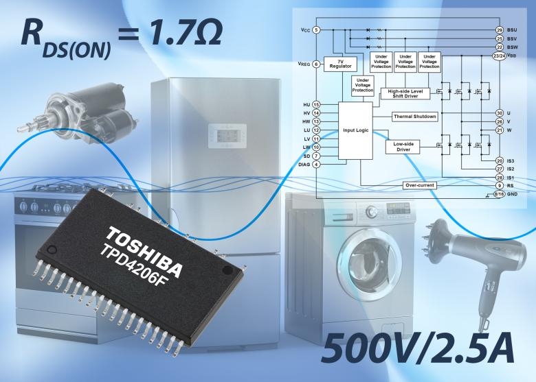 Le TPD4206F de Toshiba prend la forme d’un circuit multipuce intelligent dévolu à la commande dse moteurs DC sans balais jusqu’à 80W (appareils électroménagers, ventilateurs et pompes industrielles…).