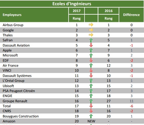 Selon le dernier classement Universum réalisé chaque année depuis 25 ans auprès des étudiants en école d’Ingénieurs, Airbus Group arrive en tête comme les années précédentes, suivi par Google et Thalès. Safran se classe 4è devant Dassault Aviation. Apple et Microsoft progresse dans le classement et prennent respectivement les 6è et 7è positions alors qu’EDF et Vinci perdent chacun 2 places et arrivent 8è et 10è. Air France enregistre une progression de 3 places et intègre le top10 pour la première fois à la 9è position.