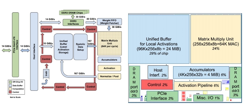 Le TPU est basé sur un réseau de 256×256 blocs MAC (multiplication et accumulation) associé à 24 Mo de buffer unifié géré au niveau logiciel. Il vise principalement à accélerer la phase d’inférence des réseaux neuronaux.